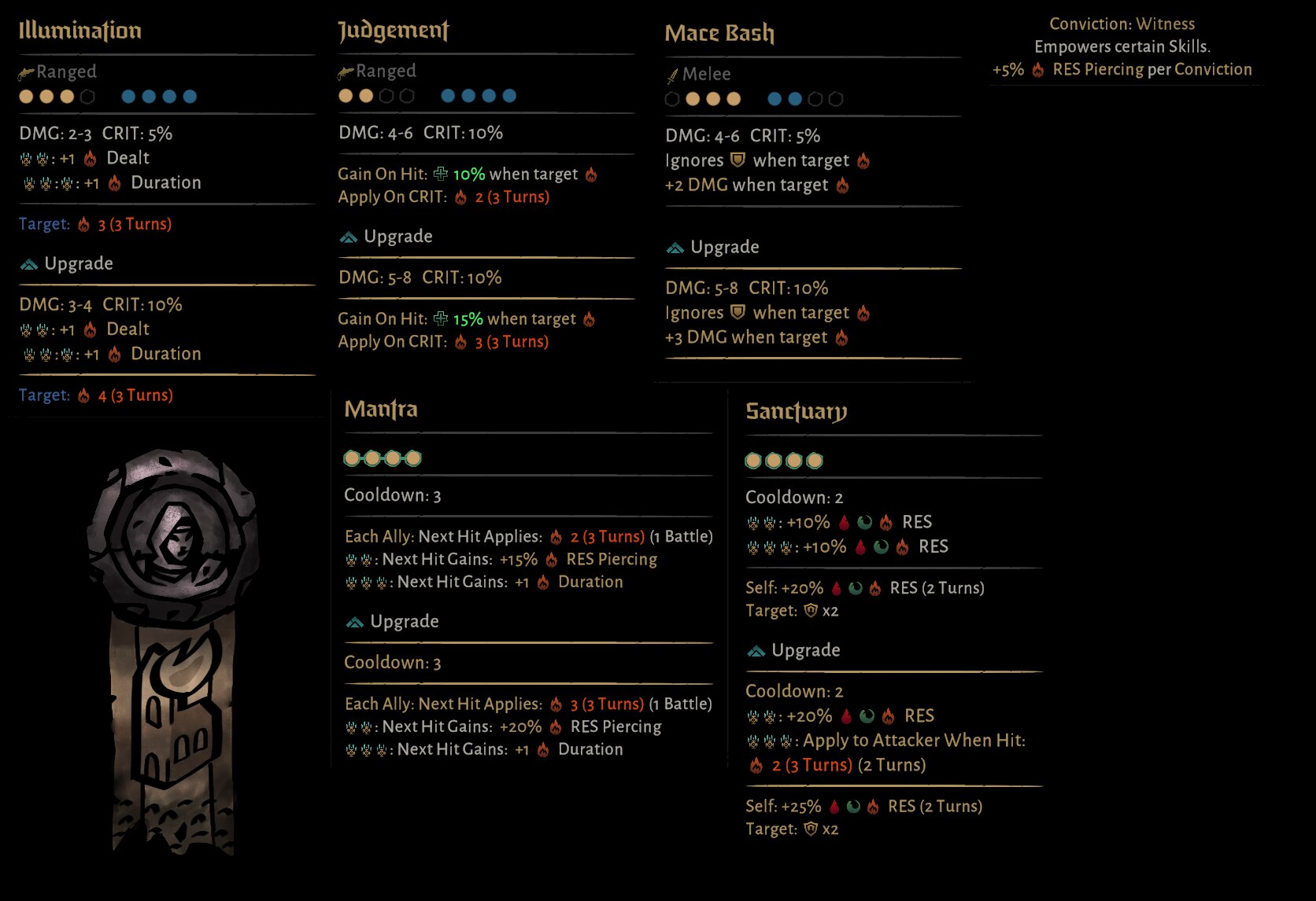 The Witness is a new Vestal path that gains many potent offensive Burn-centric tools, as well as an anti-DoT Guard, an excellent way to protect heroes vulnerable to these ailments. The Witness is at home in ranks 2 and 3, and aims to spend more time attacking than the average Vestal thanks to her powerful Burn synergies.